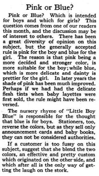 Hover over the newspaper clipping to read more about the history of pink and blue. Can you think of other things we take for granted that could be socially constructed?